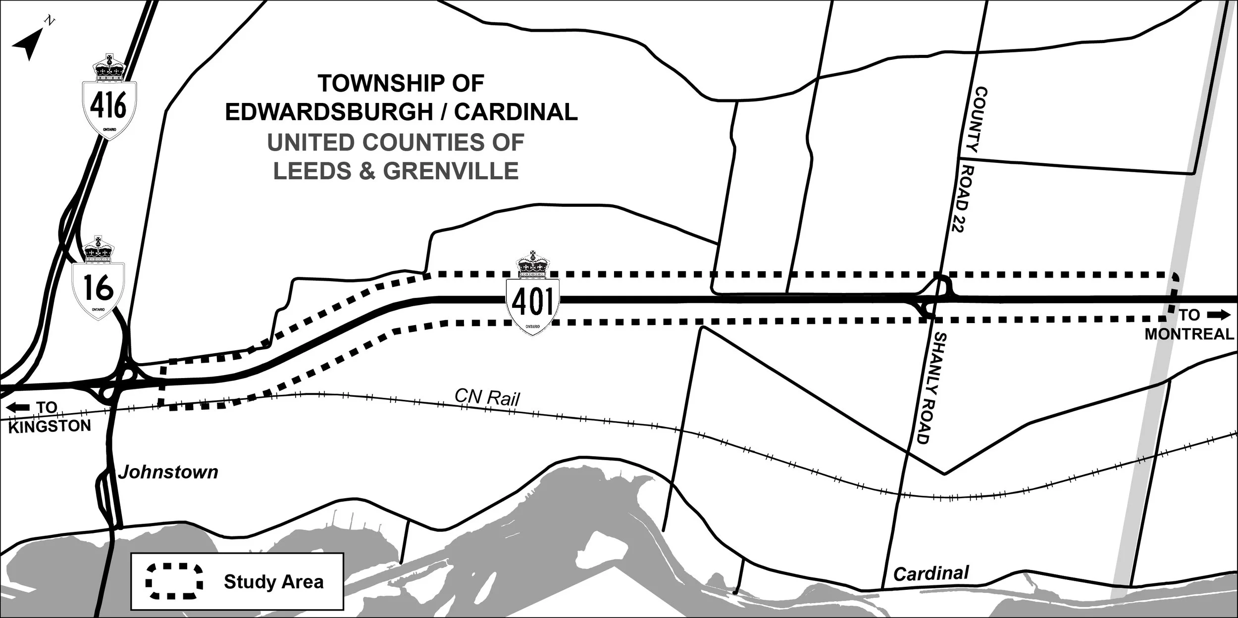 The study is to identify a Recommended Plan that addresses current and future needs for the provincial highway network. This study will include reviewing existing conditions, developing and evaluating alternatives, identifying appropriate improvements, and developing environmental protection/mitigation measures. A Recommended Plan will be confirmed and designated (protected) at the completion of the study. The Study area falls within the Township of Edwardsburgh/Cardinal, United Counties of Leeds & Greenville as shown in the key plan.